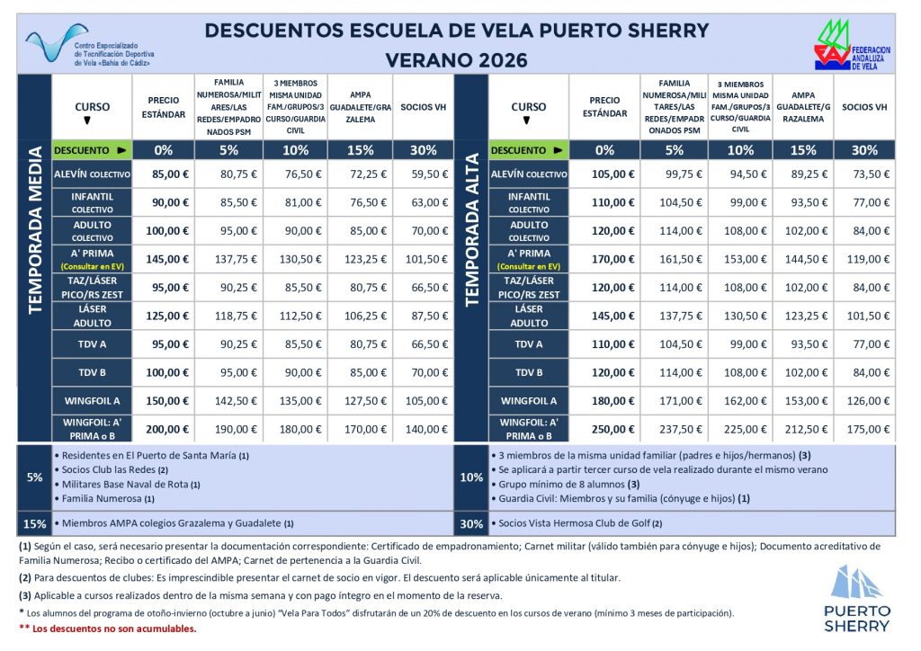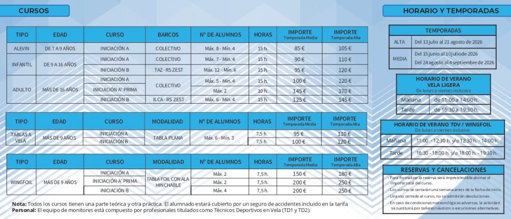 (**) Durante el desarrollo de los cursos, los alumnos estarán cubiertos por un Seguro de Accidentes, incluidos en la tarifa.(***) El cuadro de monitores está formado por personal titulado por la Federación Andaluza de Vela.