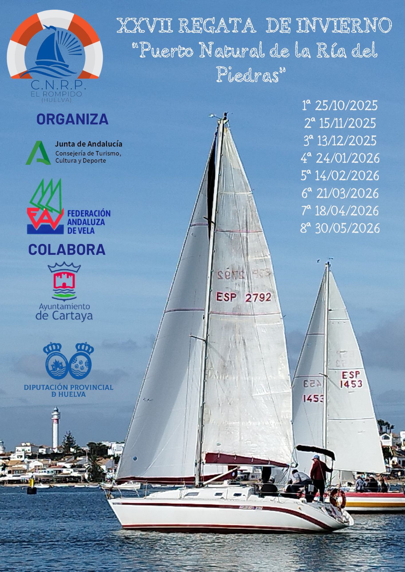 El próximo sábado 25 de octubre arranca en aguas onubenses una nueva edición, la vigesimoséptima, de la Regata de Invierno que organiza el CN Río Piedras, con la colaboración de la Federación Andaluza de Vela, la Junta de Andalucía, el Ayuntamiento de Cartaya y la Diputación de Huelva.